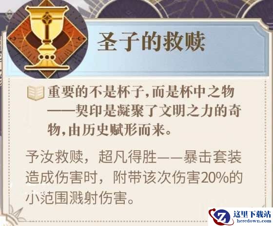 契印搭配上,小伙伴们可以选择圣子的救赎四件套,可以额外提升20%暴击率,同时还能获得二段伤害。