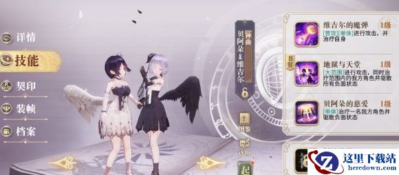 贝阿朵&维吉尔的恢复能力虽然和《诗经》攸宁不相上下,但和攸宁还是有很大区别的。首先贝阿朵&维吉尔的普攻伤害会比攸宁高一些,但只能治疗自身。书界技能“地狱与天堂”是大范围技能,造成伤害的同时治疗范围内所有友方单位,在范围上比攸宁略小一点。贝阿朵&维吉尔没有被动技能,取而代之的是多了一个主动技能,“贝阿朵的慈爱”的效果是消耗一点能量选择我方一名角色进行治疗净化,有很高的机动性。