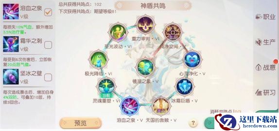 神盾共鸣天赋分支,有溶血之泉(V级效果每损失10%气血,额外增加3.5%治疗量)、