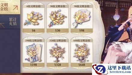 游戏中人民币和文明金枝是一比一兑换的,充值了几块钱就能获得同样数量的金枝,最小充值金额是6元,最高为648元。