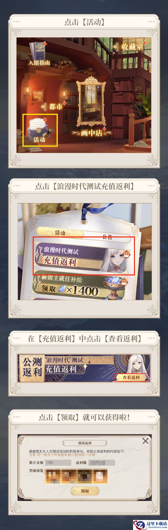 馆主在公测期间,使用“浪漫时代”删档计费测试时进行过充值的同一账号在同一安卓渠道下载登录游戏,可通过以下步骤领取返利。