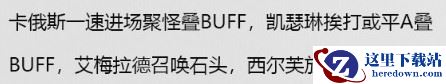 基本上就是卡俄斯开局进场直接聚怪和上buff,凯瑟琳的任务就是打人和被打,借此给对方上buff,之后靠艾梅拉德的召唤物和西尔芙的大招输出。