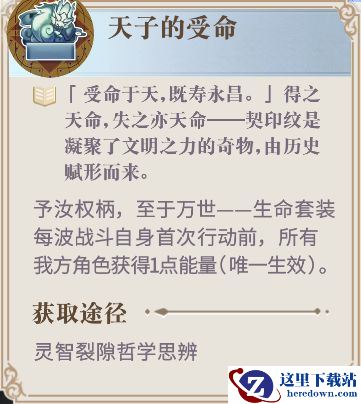 首先对于召唤流阵容,在召唤出足够召唤物前,还是需要幻书自身来抗伤害的。而【天子的受命】的套装效果不但可以增加幻书的生命值,同时还可以让装备这套契印纹的幻书行动时,为我方所有幻书增加1点能量,从而让队伍在第一轮就可以直接发动书界技能进行爆发,因此是前排必带的契印纹。因为它的被动能力是唯一效果,所以有且只有一位幻书携带即可。