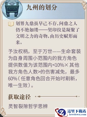 虽然召唤物能够抗住非常多的伤害,但遇到群伤较多的关卡时,有时还是会力不从心。契印纹【九州的划分】的特殊效果是为自身小范围内的角色提供减伤效果,每有一个其他我方角色,减伤增加10%。对于召唤流阵容来说,如果你觉得前排的坦度不足以撑过对方的爆发,那么【九州的划分】可以大大增加前排幻书的坦度。