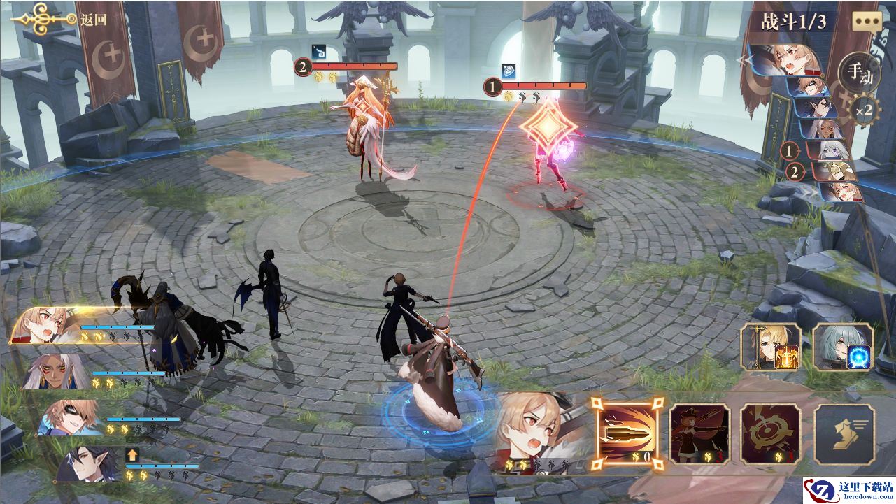 为了方便称呼,敌人就称为魔女和圣女了,敌人是标准的1奶1C,按照一般情况来说我们肯定是现集火奶妈,然而奈何敌方这个奶妈属实太过平庸,反而是输出威胁较大,所以第一面我们优先击杀魔女,留下一个奶妈慢慢折磨就好。