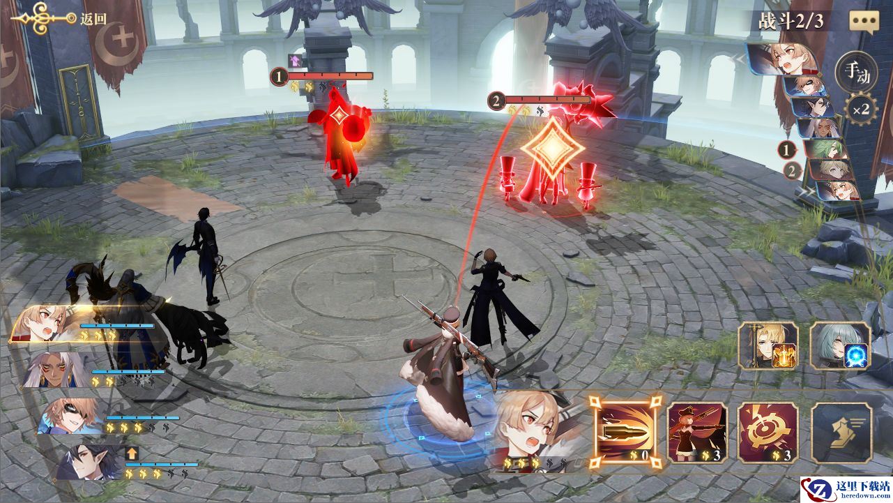 第二面敌人为抱朴子和纳兹,抱朴子的技能看似很恶心,又是禁足又是换位,但纳兹的伤害实在太高,对比恶心的效果还是直接的高攻单位威胁更大,所以这一面我们优先处理纳兹,争取不要让他开出技能。