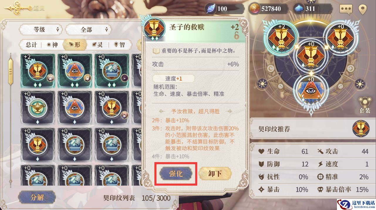 强化契印纹可以在契印纹套装的基础上,为幻书增加更多的属性加成。所以为了让自己的阵容变得更强,强化契印纹必不可少。因为随机属性的缘故,形、神、灵、智四种契印纹搭配能有更多可能性,可以辅助我们组建更多的阵容类型,值得大家去深入研究。