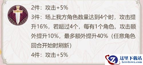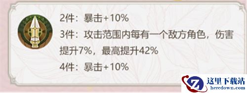 20%暴击率加成,敌人在场数量越多伤害倍率越高,非常契合珍珑【大龙对杀】的技能机制,即:根据攻击范围内的 我方角色数量增伤。在怪多的副本中增伤收益高,怪少的BOSS本不太推荐。