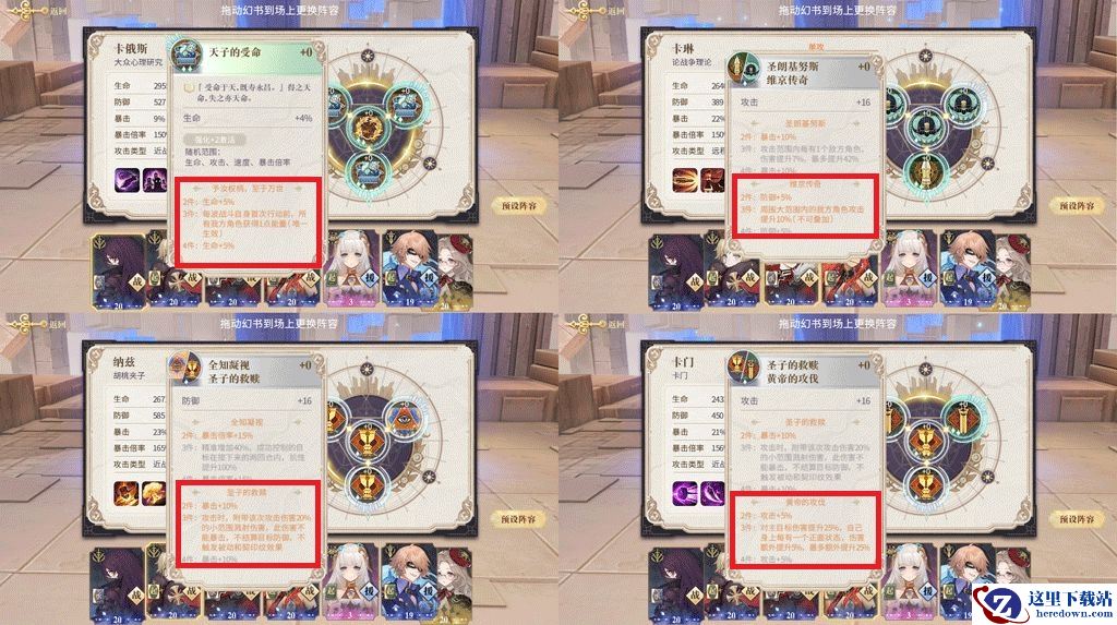 契印纹方面用初始获得的就行,但《大众心理研究》卡俄斯必须要配一套【天子的受命】,可以让我方快速获得能量放技能。而《论战争理论》卡琳需要带【维京传奇】,从而提升全队的伤害。两名输出配成一套输出契印纹就可以。