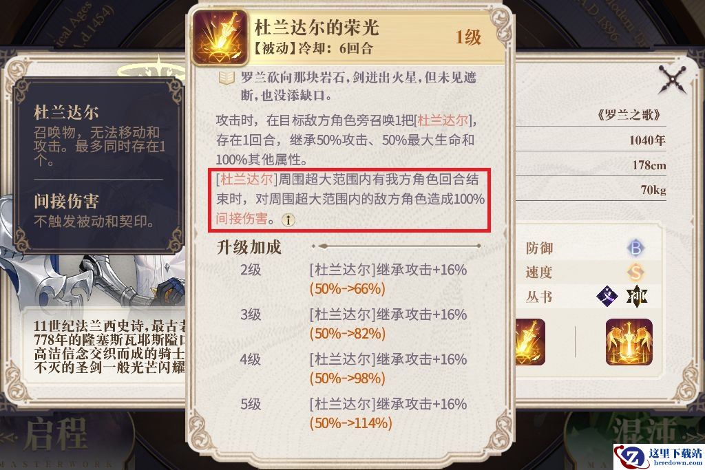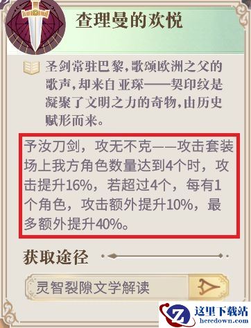 契印方面推荐带【查理曼的欢悦】,它的套装效果是我方角色越多攻击力越高,因此可以有效提高《罗兰之歌》罗兰的技能伤害。