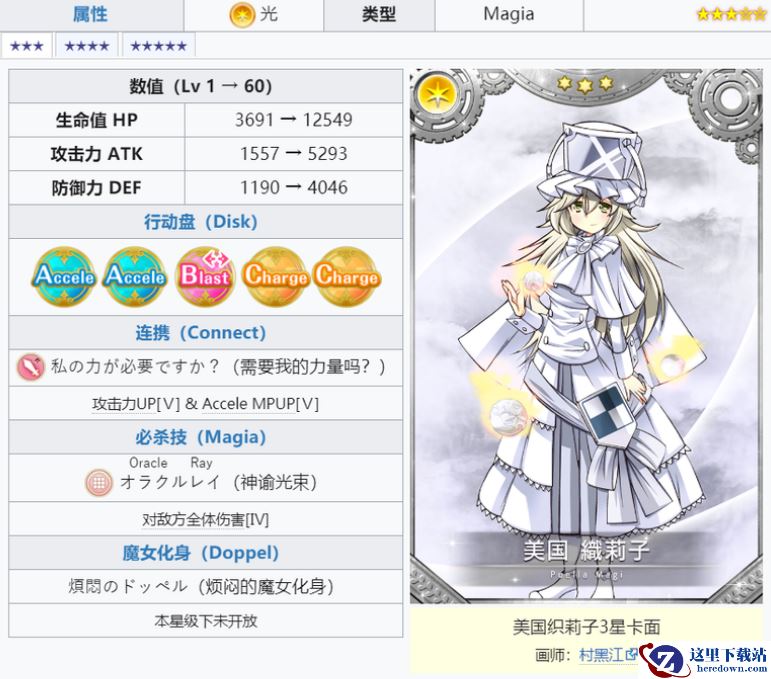 在游戏开局前期缺光属性的时候可以先练,但单孔下并不好用。Magia有回避和回复自身MP,在推图方面表现欠佳,但在镜像十分好用。是新手打镜像的好伙伴。