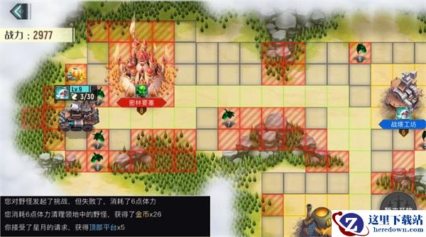 灰色的格子是尚待开拓地区,绿色格子代表走过的路径,黄色格子代表已攻占的城堡区域,红色格子里则包括城堡、野怪、宝箱、随机事件,以及地图障碍。