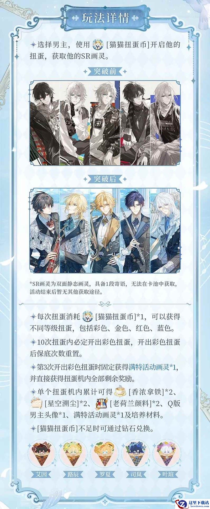 ►10次扭蛋内必定开出彩色扭蛋,第3次彩色扭蛋的奖励固定为对应男主的满特SR画灵,同时可直接带走扭蛋机内全部剩余奖励。