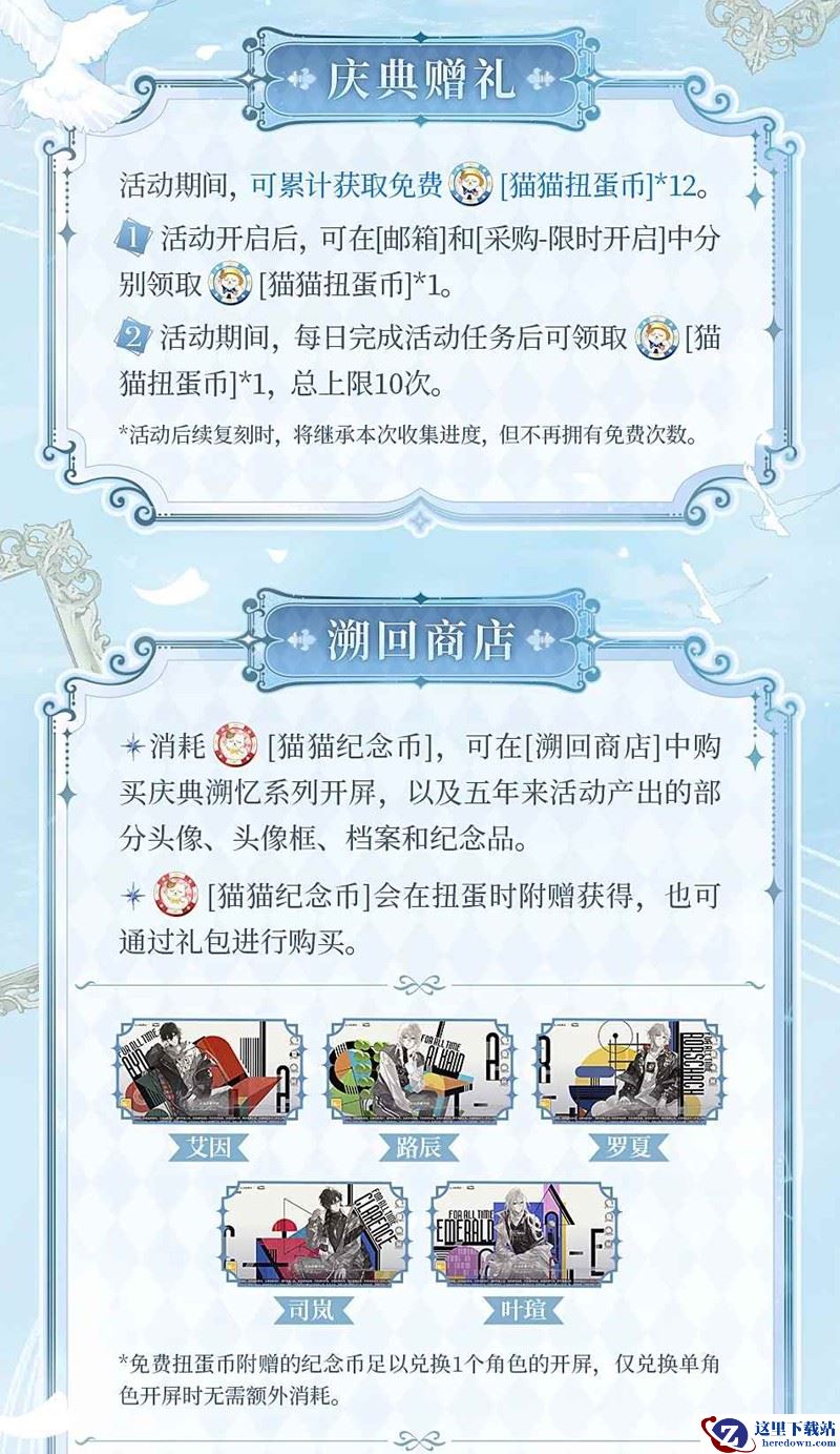 ►每次扭蛋均会附赠[猫猫纪念币]*1,可在[溯回商店]兑换庆典溯忆系列开屏,以及五年内活动产出的部分头像、头像框、档案、纪念品。