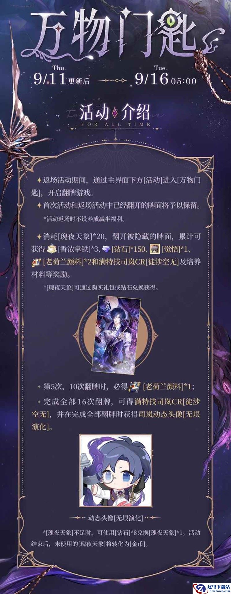 9月11日更新后 - 9月16日05:00,通过主界面下方[活动]进入「万物门匙」。消耗[瑰夜天象]翻开被隐藏的牌面,可得[钻石]、[觉悟]、[老荷兰颜料]和司岚CR[徒涉空无]等奖励。