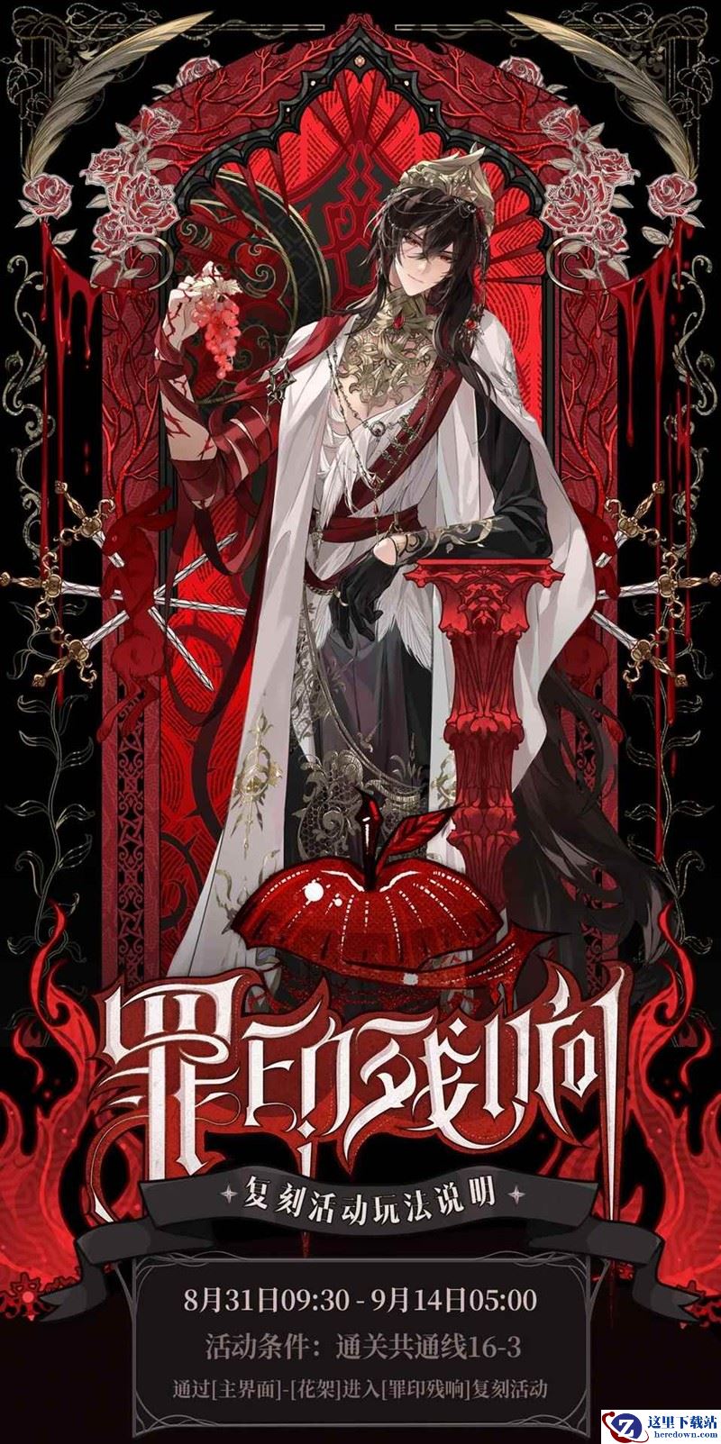 开启时间:8月31日09:30 - 9月14日05:00,通过[花架]进入「罪印残响」复刻活动。