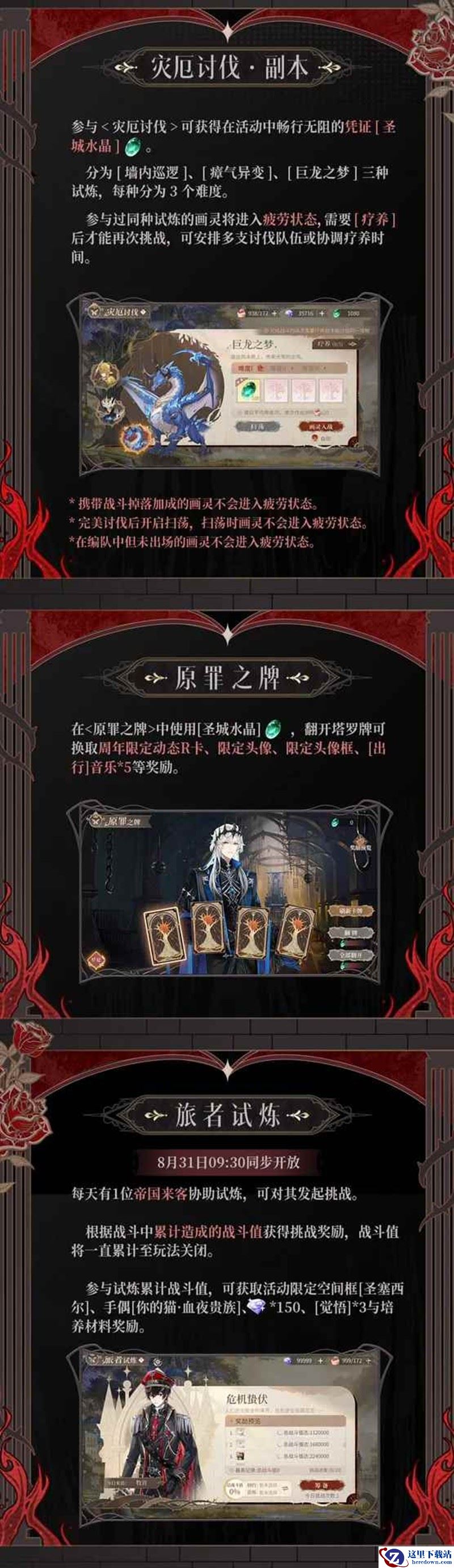 ► 参与<灾厄讨伐>获取[圣城水晶],可在[原罪之牌]中翻开塔罗牌换取周年限定动态R卡、限定头像框、[出行]音乐等奖励。