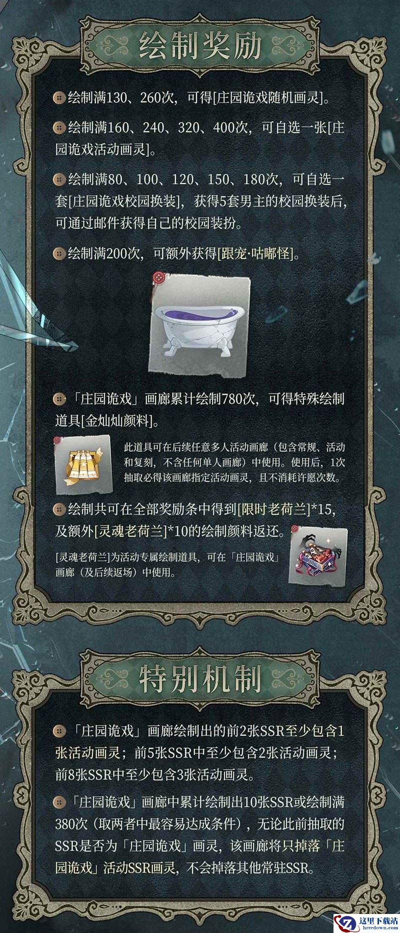 ► 绘制次数达130、260次,可得[庄园诡戏随机画灵];绘制次数达160、240、320、400次,可自选一张[庄园诡戏活动画灵]。