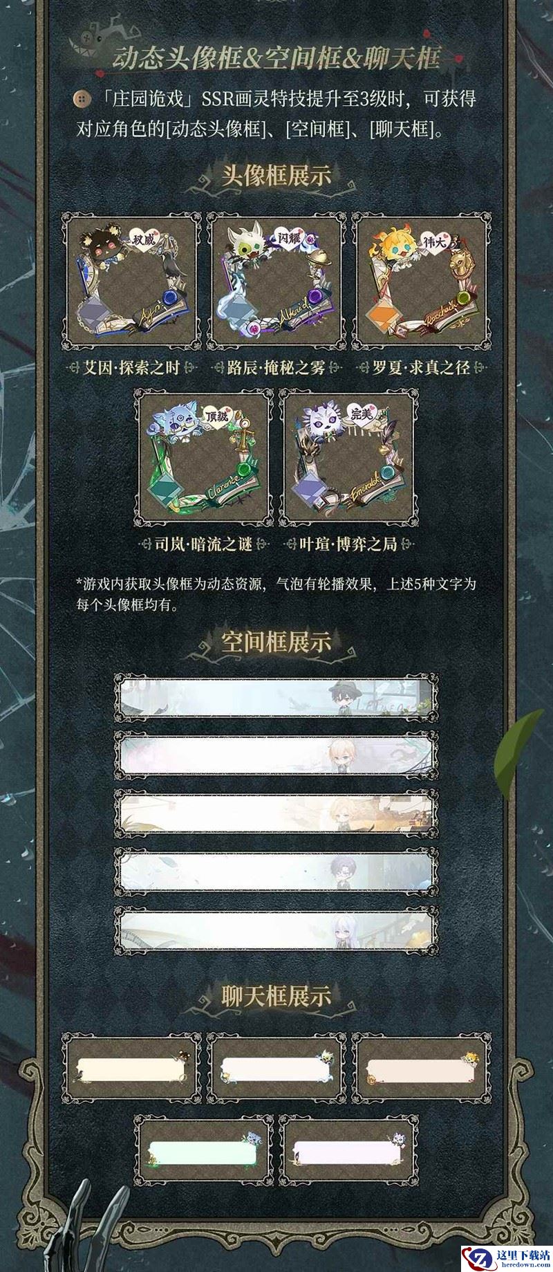7月10日更新后 - 7月30日05:00,全新「庄园诡戏」活动卡池限时开启。活动期间,艾因SSR[坠时伪生]、路辰SSR[心渊渡梦]、罗夏SSR[明日将至]、司岚SSR[不归漫流]、叶瑄SSR[永无匣子]获得概率提升。卡池具备许愿功能,活动结束后,以上画灵暂无获取途径。