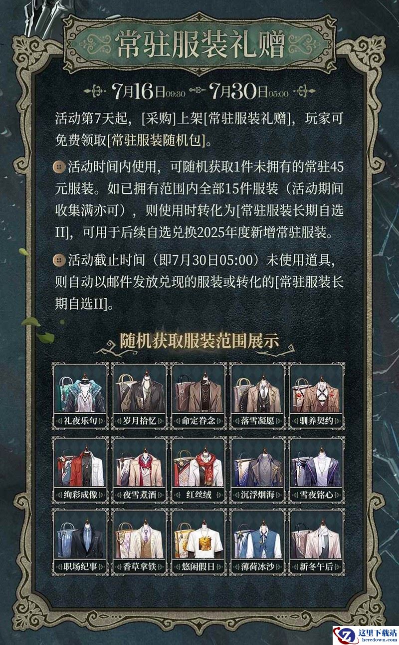 7月16日09:30 - 7月30日05:00,[采购]上架[常驻服装礼赠],可免费领取[常驻服装随机包],详情可查看图片。