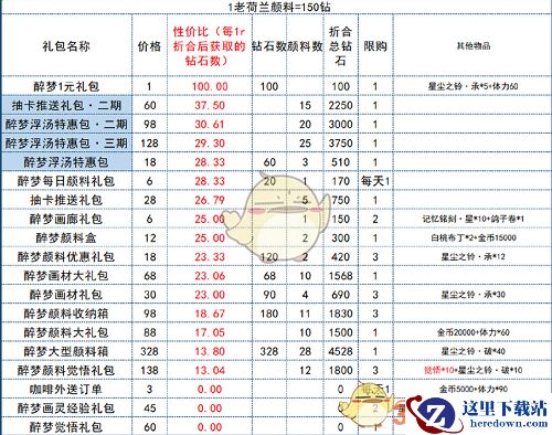 1、上图就是这次醉梦浮场礼包性价的对比了,对于很多不知道优先购买哪些礼包的可以参考一下。