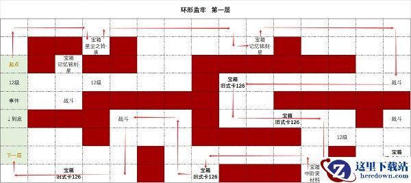 1、环形监牢第一层中有九个宝箱,玩家可以按照上图红色箭头的位置走,可以拿到全部的宝箱。