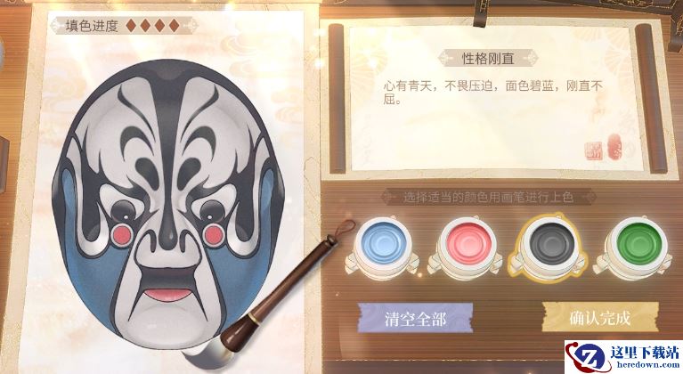 一张脸谱会有四个填色区域,可以通过上面的填色进度查看自己填色了几个区域,等到四个全部填满即可点击右下角的确认完成。