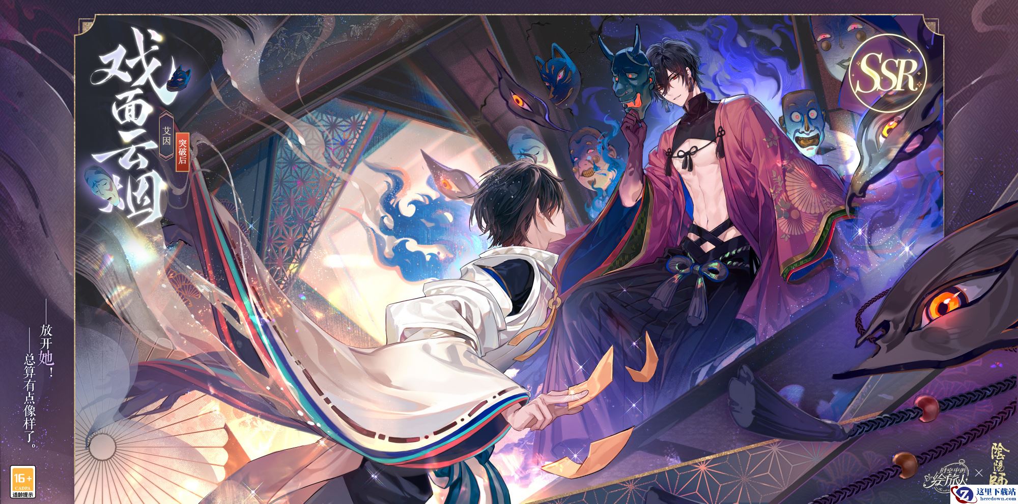 SSR画灵[戏面云烟]属特殊联动画灵,具备获取时台词特别展示;突破后具备横幅卡面、[流光]效果,可设为登录界面。