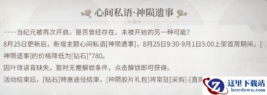 8月25日更新后,新增主题心间私语[神陨遗事],8月25日9:30-9月1日5:00上架首周期间,[神陨遗事]的价格降低为[钻石]*780。