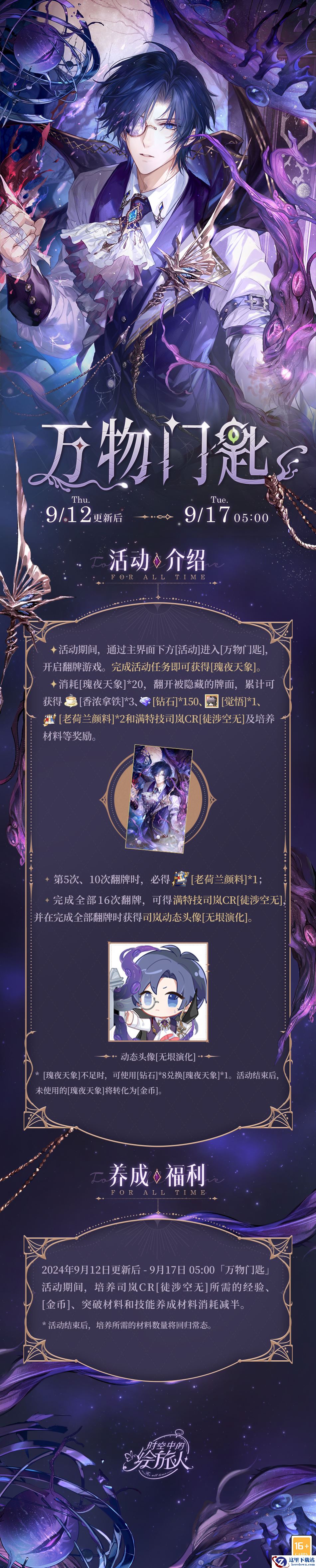 9月12日更新后 9月17日05:00,参与活动「万物门匙」可获取司岚CR[徒涉空无]。