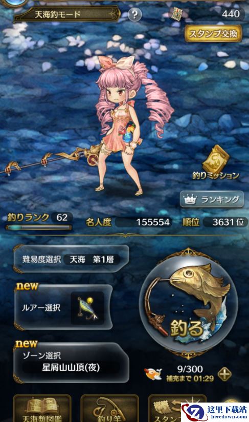 左侧选择为难易度,鱼饵,钓鱼地点,不同的难易度钓鱼的等级也不相同,分别为1星和4星鱼,高难度当然成功率也相对会相对下降。