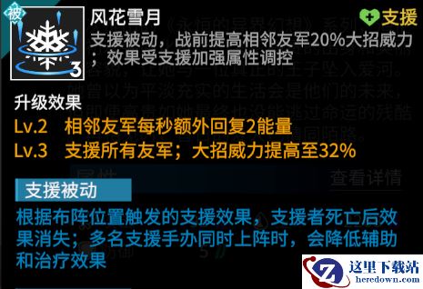 海伦支援被动可以战前提高相邻友军大招威力,适合围绕海伦组建大招流派,其效果受支援加强属性调控。被动升级后,相邻友军每秒额外回能增加,相比大招的瞬间回能可能会能量回复过剩的情况,每秒回能效果更稳定,能进一步提高大招流输出手办的大招启动速度和释放频率。被动升到3级后,可支援所有友军,布阵灵活性大增。