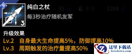 作为支援职业,海伦具有支援专属的职业被动,每数秒治疗随机单体友军,配合大招的群体治疗以多种治疗手段治疗队友。专属额外提供了最大生命和防御,最大生命值可以提高大招和被动的治疗效果,防御则可以提高海伦的生命质量。