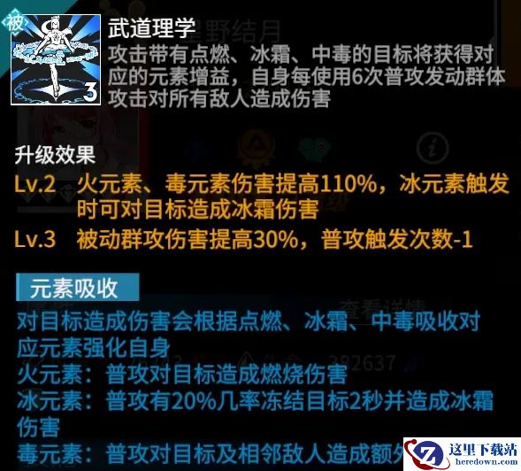 星野结月攻击带有点燃、冰霜、中毒状态的目标会获得对应的元素增益,每种元素都会强化她的普攻和大招。