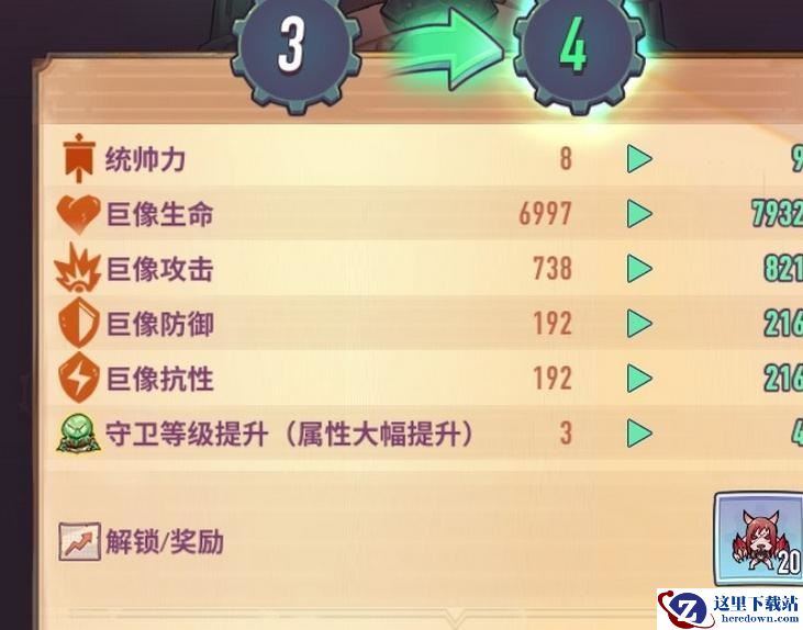 研究巨像升级,可以提升巨像的统帅力、生命值、攻击、防御、抗性、以及守卫最大等级。提升巨像等级还能解锁一些新兵种。