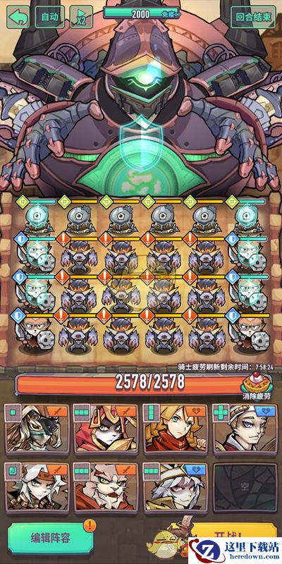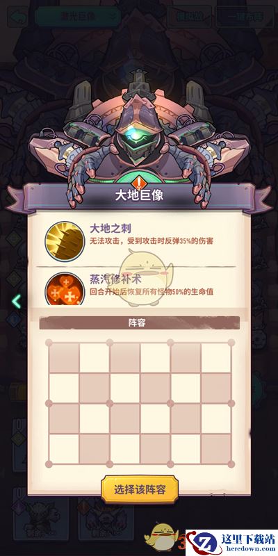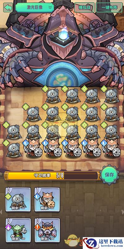 8、除了布置阵容以外,我们还可以选择巨像守卫的类型,在当前版本的游戏中我们一共可以选择3种不同的巨像,它们有着不同的技能组;合理利用并且搭配布阵才能助你更好地守住自己的领地,在布置完毕之后,你还可以点击画面右上方的“模拟战”实验阵容强度。