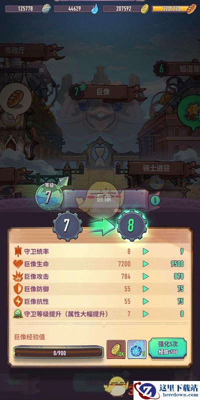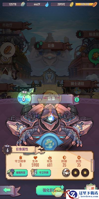 说完进攻再说说【领地争夺】系统中防守方的不止,首先在通关52关后,会新增一个城镇建筑【巨像】我们可以直接在这里看到巨像的生命力、攻击力、防御力、抗性等属性。