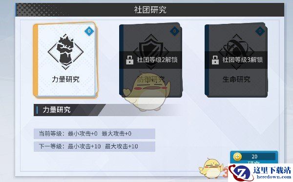 3、社团里面的研究由三个部分组成,分别是力量研究、防御研究和生命研究,其中力量研究是不需要附加条件就可以升级,防御研究需要社团等级达到2级才可以解锁,生命研究需要社团等级达到三级。