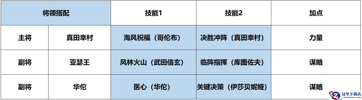这个阵容以真田幸村为主将,亚瑟王和华佗为副将。以真田幸村为主要输出,其可通过抵御伤害来进行反击,单回合最多可造成5次伤害。所以搭配2个医师型将领,不仅可以为部队提供多次的兵力恢复,还可以提高主将的输出能力,这套阵容还搭配了其他辅助增益技能,可通过持久战斗拖垮敌方部队。