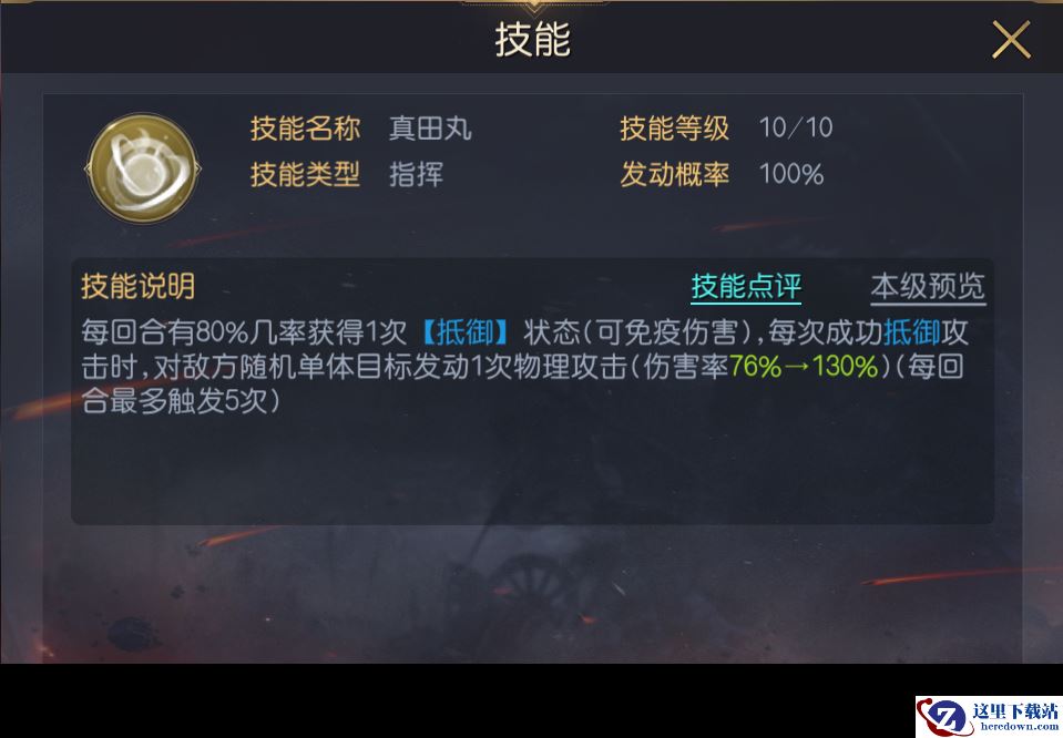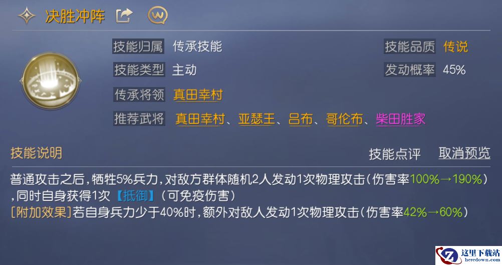 2号技能推荐【关键决策】,该技能在战斗开始的前3回合,降低敌我双方全体造成的谋略伤害,并且降低己方全体受到的物理伤害,从第4回合开始提高己方全体物理伤害。作为以物理输出为主的真田幸村,开局谋略输出的debuff对于我方部队的影响微乎其微,但之后的增伤效果却非常拥有。