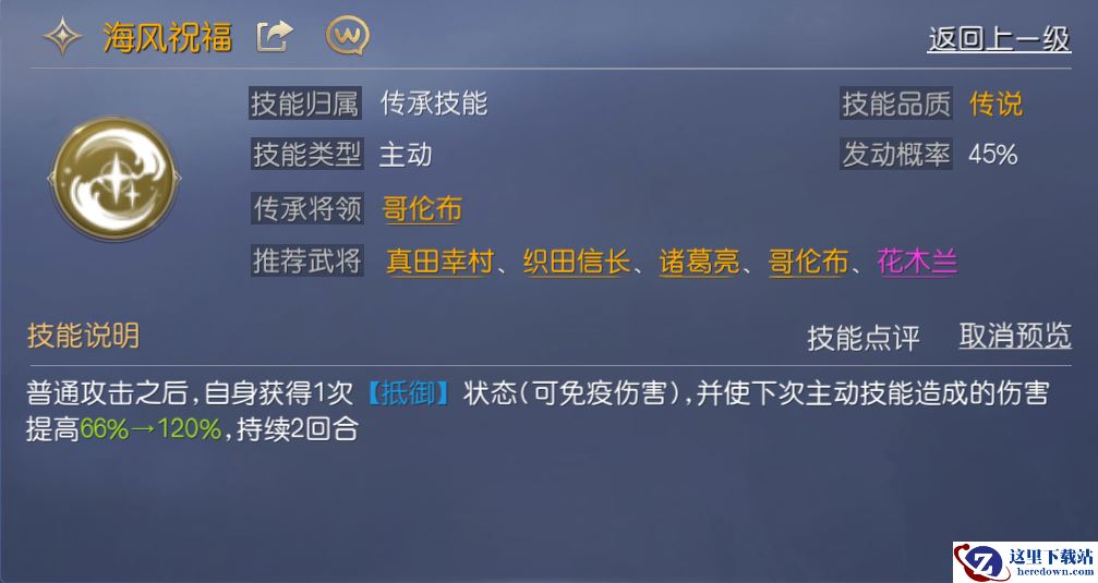 1号技能推荐真田幸村学习海风祝福,该技能可在携带者普攻之后为其提供1次抵御,并提高下次主动技能伤害,增幅率达到120%,前者可提高真田幸村的抵御反击能力,后者可提升真田幸村的主动输出能力。
