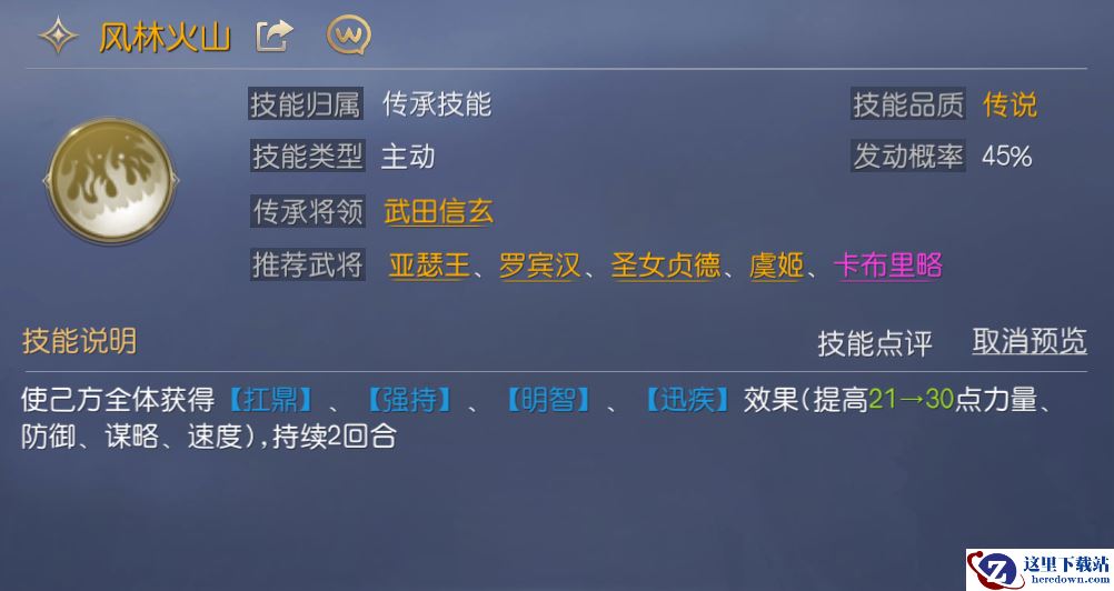 1号技能推荐【风林火山】,可以为己方全体提供力量,谋略,防御,速度全方位的属性加成,持续2回合。大大提升了部队整体的战斗力,是一个非常实用的辅助型技能。
