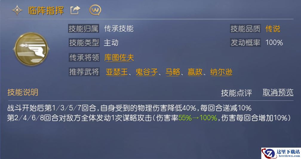 2号技能推荐【临阵指挥】,战斗开始后的1/3/5/7回合,可以降低自身受到的伤害;第2/4/6/8回合,都可以对敌方全体发动1次谋略攻击,伤害会逐渐递增。这是一个兼备防御与输出的指挥型技能,可提高亚瑟王的承伤能力,同时为队伍补充伤害输出。