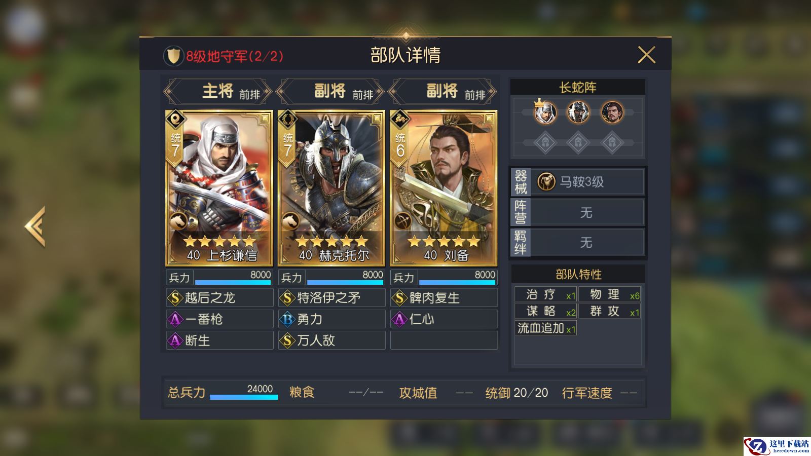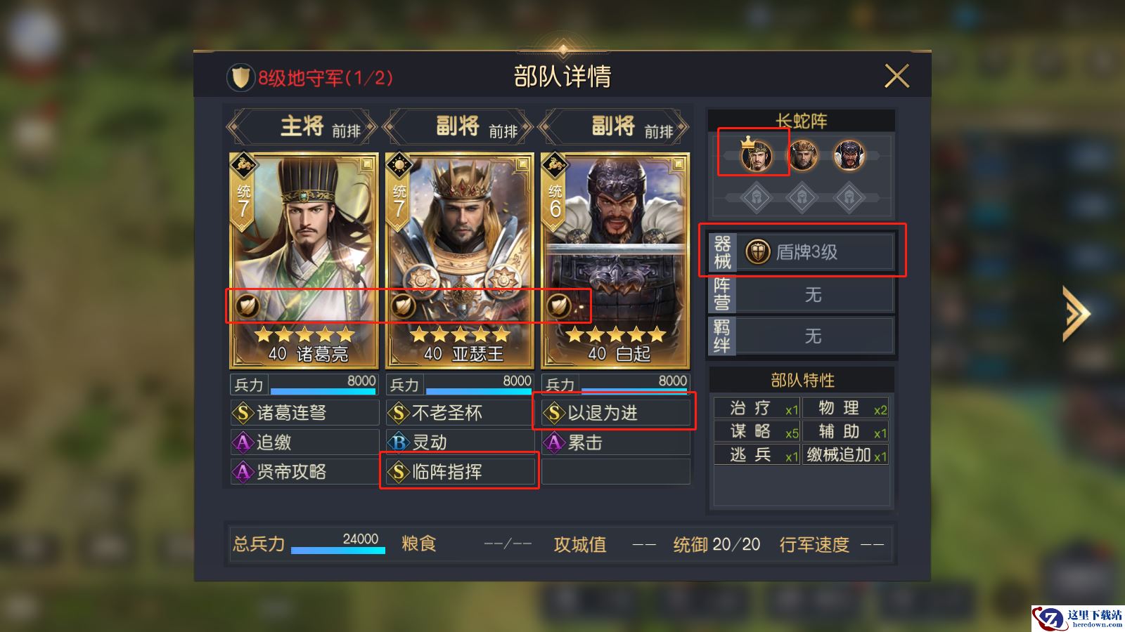 8级地部队数量提高到了24000*2,相比于7级地提高了整整6000的兵力,虽然都为全五星阵容,但8级地守军的将领属性、技能都强于7级地,且将领等级提高到了40级,而且技能等级也都来到了7+5+3这个水平,器械也得到升级。最主要的提升在于守军的搭配更合理,基本都为输出+前排或输出+治疗的配置。