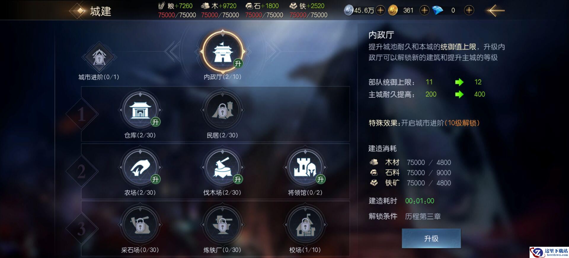 许多建筑对于内政厅的等级都有要求,因此要及时升级内政厅来解锁新的建筑。