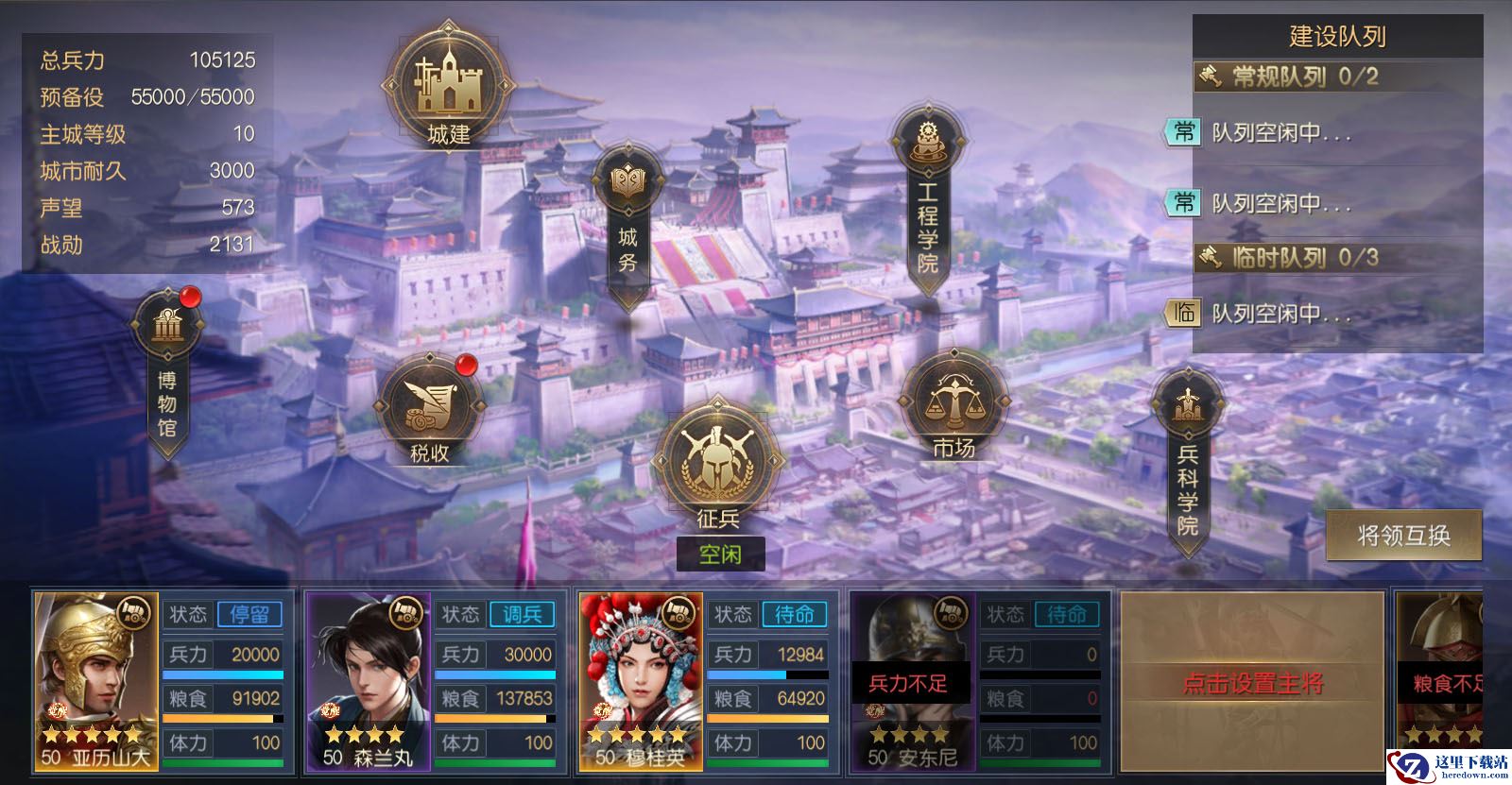 当玩家将内政厅升到4级之后,这里推荐大家将点将台升1级即可,因为在前期,大部分玩家只能培养一队主力,1级点将台即可保证主队上阵三名将领;兵役所点到3级就能够满足前期征兵的需求,而且兵役所的升级优先级并不很高,五本之前点1到2级即可;营地开荒阶段不点。