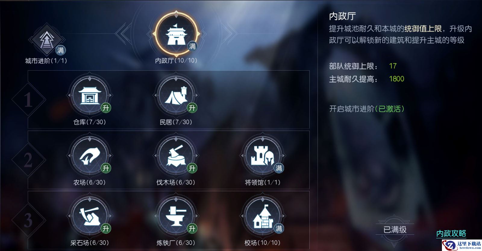 随着内政厅等级的提升,将会解锁不同的城建科技,其中有一类最重要的城建,那就是兵营或者军营,他能够提升部队将领的基础兵力,兵力上去了,开荒自然就很简单了,所以一般兵营科技的点亮,也意味着开荒阶段告一段落,在《征服与霸业》中,当内政厅等级达到七级,就能够解锁兵营,因此,针对开荒阶段的城建升级顺序,这里主要介绍七本之前的。