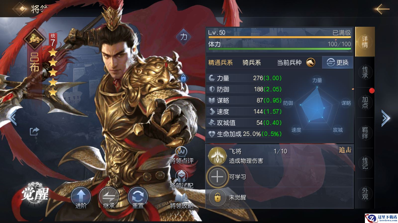 按照上述思路,这里分别对适合开荒的五星将领和四星将领进行推荐。首先是五星将领中的吕布,他具有极高的力量成长属性,这也意味着他的物理输出能力很强,同时防御属性也不弱,在一定程度上减少了开荒中的兵损,更为重要的是,其自带技能【飞将】为追击类技能,不受【技穷】效果的影响,满级之后有高达70%的发动概率,而且有极强的aoe能力,能够更好地缩短战斗回合数,减少我方兵损;