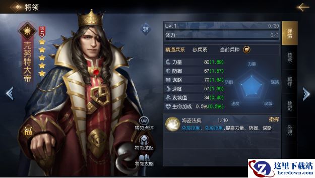 克努特是一名来自西洋阵营的辅助将领,他的各项属性都比较均衡,可以主速度走先手释放免疫或其他技能,也可以补力量或谋略补充输出或治疗,考虑克努特大帝功能性较强,建议主加速度和谋略,提升先手率和治疗率。