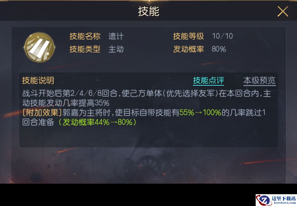 【郭嘉】自带技能【遗计】在战斗开始后的第2、4、6、8回合,使己方单体(优先选择友军)在本回合内,主动技能发动几率提高35%;【附加效果】自身为主将时,额外使该单体自带技能有几率(初始55%,满级100%)跳过1回合准备。